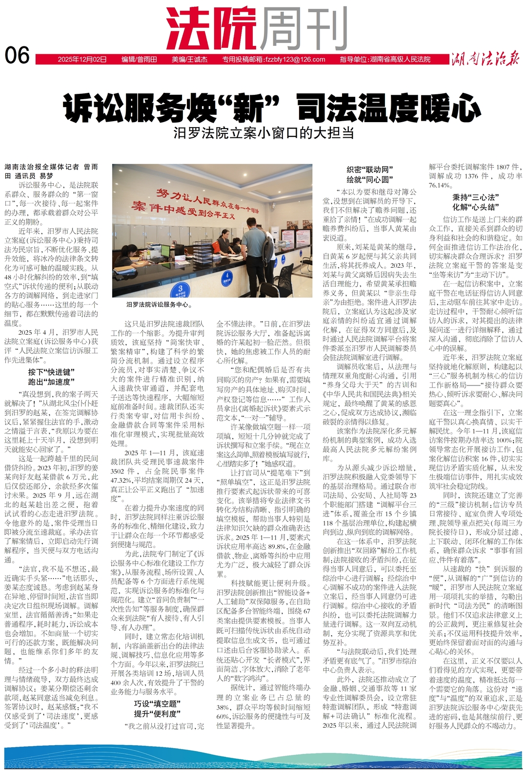 從速裁的“快”到訴服的“便”,從調(diào)解的“廣”到信訪的“暖”,汨羅市人民法院立案庭用一項(xiàng)項(xiàng)扎實(shí)的舉措,勾勒出新時(shí)代“司法為民”的清晰圖景。他們不僅追求法律意義上的公正裁判,更注重修復(fù)社會(huì)關(guān)系;不僅運(yùn)用科技提升效率,更始終保留著面對(duì)面的溝通與心貼心的關(guān)懷。