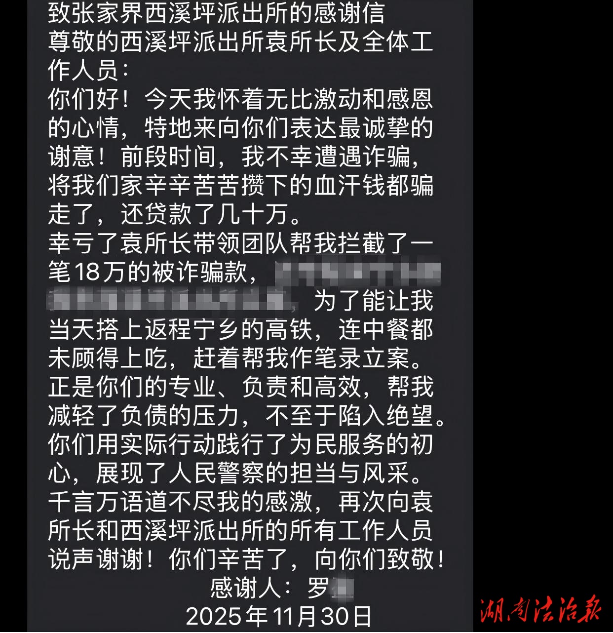 湖南法治報訊(通訊員 宋薇)近日,西溪坪派出所成功攔截 18 萬元被騙資金,為群眾及時挽回?fù)p失。